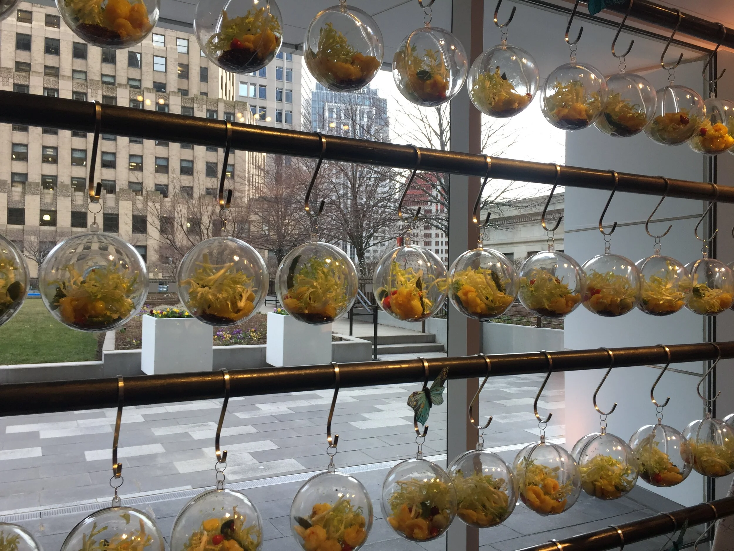 As a planner, it’s my job to stay ahead of the curve with regards to food display. Instead of hiding food stations along the perimeter of the event, incorporate them as decor pieces! I love the idea of hanging orbs filled with greens and other colorful julienned vegetables. Suspended from horizontal piping, the orbs feel futuristic and cool, while also being completely practical!